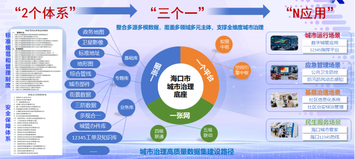 海口市城市治理数据体系采用“2个支撑体系+3个一核心+N类应用”的分层架构(见图1、图2),实现数据从采集、治理到应用的全链条贯通。其中,“2个支撑体系”为管理制度体系与安全保障体系,涵盖数据分级分类标准、跨部门协同机制、三级等保防护措施及ISO9001质量管理规范,为数据安全合规流转提供保障;“3个一核心”即“一张网、一张图、一个平台”的数据底座,是体系运行的核心支撑;“N类应用”则覆盖城运、应急、民生等多个治理领域,形成场景化解决方案。