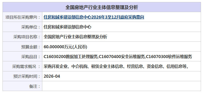 | 12 | 住房和城乡建设部信息中心 | 全国房地产行业主体信息整理及分析 | C16030200数据加工处理服务,C16070400安全运维服务,C16070300软件运维服务 | 详见项目详情 | 60.000000 | 2026年04月 | 详见项目详情 |