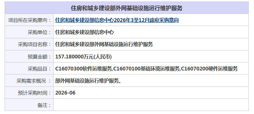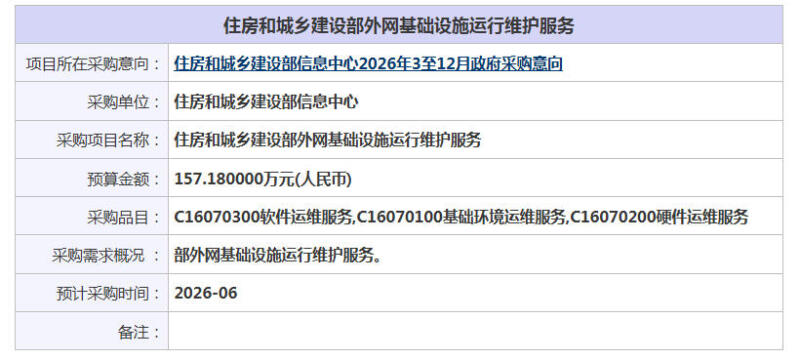 | 4 | 住房和城乡建设部信息中心 | 住房和城乡建设部外网基础设施运行维护服务 | C16070300软件运维服务,C16070100基础环境运维服务,C16070200硬件运维服务 | 详见项目详情 | 157.180000 | 2026年06月 | 详见项目详情 |