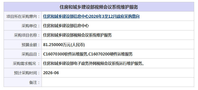 | 5 | 住房和城乡建设部信息中心 | 住房和城乡建设部视频会议系统维护服务 | C16070300软件运维服务,C16070200硬件运维服务 | 详见项目详情 | 81.250000 | 2026年06月 | 详见项目详情 |
