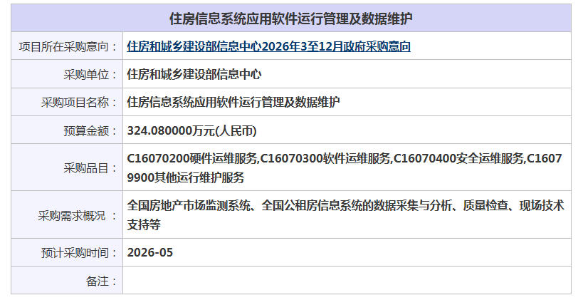 | 10 | 住房和城乡建设部信息中心 | 住房信息系统应用软件运行管理及数据维护 | C16070200硬件运维服务,C16070300软件运维服务,C16070400安全运维服务,C16079900其他运行维护服务 | 详见项目详情 | 324.080000 | 2026年05月 | 详见项目详情 |