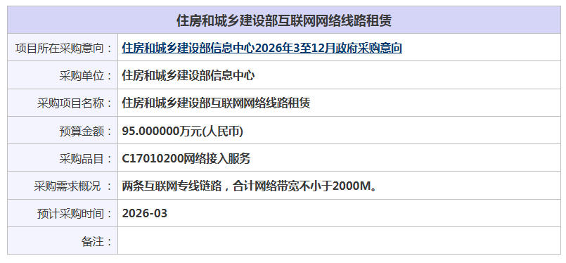 | 2 | 住房和城乡建设部信息中心 | 住房和城乡建设部互联网网络线路租赁 | C17010200网络接入服务 | 详见项目详情 | 95.000000 | 2026年03月 | 详见项目详情 |