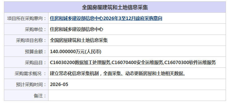 | 11 | 住房和城乡建设部信息中心 | 全国房屋建筑和土地信息采集 | C16030200数据加工处理服务,C16070400安全运维服务,C16070300软件运维服务 | 详见项目详情 | 140.000000 | 2026年05月 | 详见项目详情 |