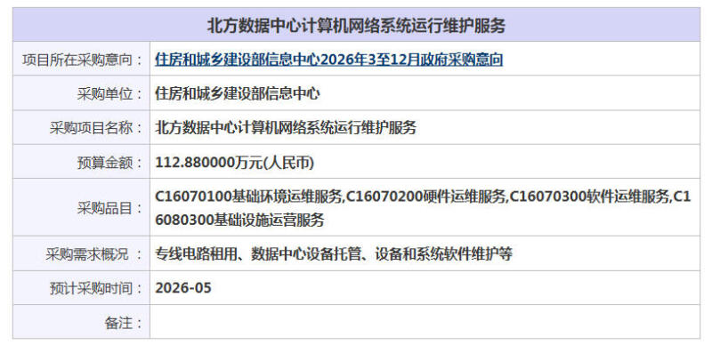 | 9 | 住房和城乡建设部信息中心 | 北方数据中心计算机网络系统运行维护服务 | C16070100基础环境运维服务,C16070200硬件运维服务,C16070300软件运维服务,C16080300基础设施运营服务 | 详见项目详情 | 112.880000 | 2026年05月 | 详见项目详情 |