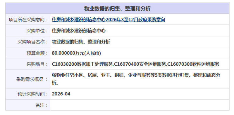 | 13 | 住房和城乡建设部信息中心 | 物业数据的归集、整理和分析 | C16030200数据加工处理服务,C16070400安全运维服务,C16070300软件运维服务 | 详见项目详情 | 80.000000 | 2026年04月 | 详见项目详情 |
