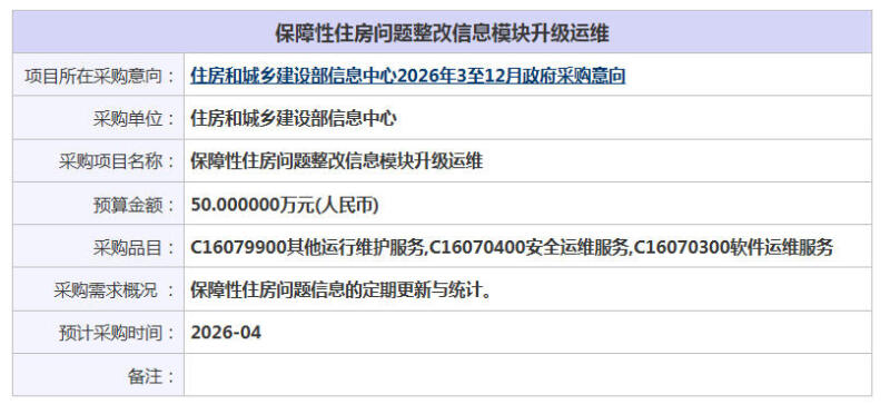 | 15 | 住房和城乡建设部信息中心 | 保障性住房问题整改信息模块升级运维 | C16079900其他运行维护服务,C16070400安全运维服务,C16070300软件运维服务 | 详见项目详情 | 50.000000 | 2026年04月 | 详见项目详情 |