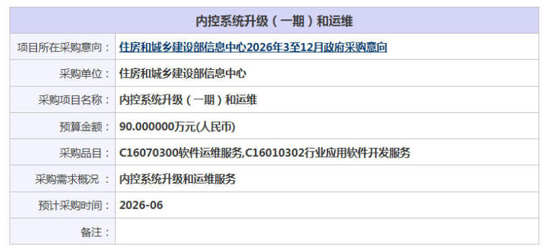 | 1 | 住房和城乡建设部信息中心 | 内控系统升级(一期)和运维 | C16070300软件运维服务,C16010302行业应用软件开发服务 | 详见项目详情 | 90.000000 | 2026年06月 | 详见项目详情 |