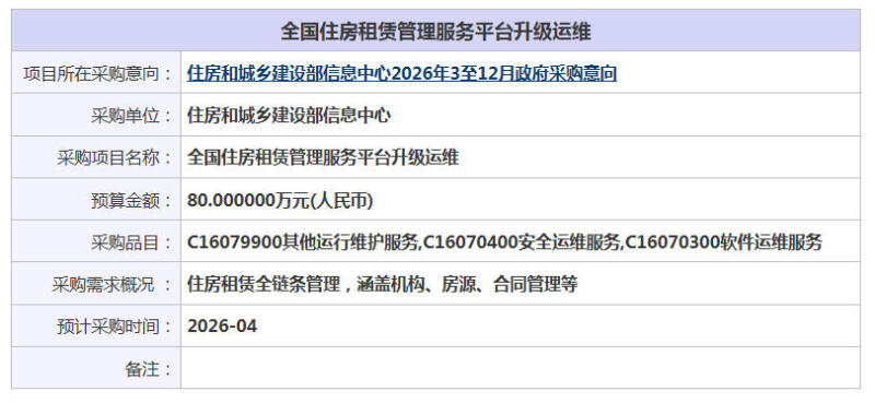 | 14 | 住房和城乡建设部信息中心 | 全国住房租赁管理服务平台升级运维 | C16079900其他运行维护服务,C16070400安全运维服务,C16070300软件运维服务 | 详见项目详情 | 80.000000 | 2026年04月 | 详见项目详情 |