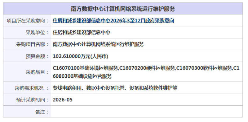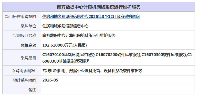 | 8 | 住房和城乡建设部信息中心 | 南方数据中心计算机网络系统运行维护服务 | C16070100基础环境运维服务,C16070200硬件运维服务,C16070300软件运维服务,C16080300基础设施运营服务 | 详见项目详情 | 102.610000 | 2026年05月 | 详见项目详情 |