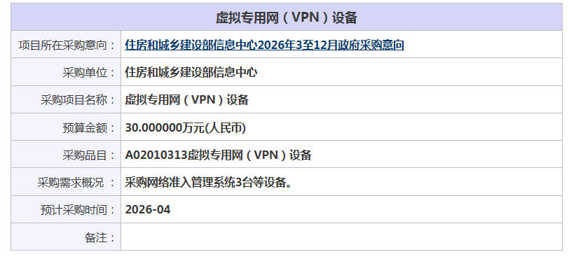| 7 | 住房和城乡建设部信息中心 | 虚拟专用网(VPN)设备 | A02010313虚拟专用网(VPN)设备 | 详见项目详情 | 30.000000 | 2026年04月 | 详见项目详情 |