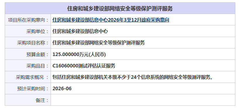 | 6 | 住房和城乡建设部信息中心 | 住房和城乡建设部网络安全等级保护测评服务 | C16060000测试评估认证服务 | 详见项目详情 | 125.000000 | 2026年06月 | 详见项目详情 |