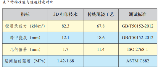 (1)结构性能与建造精度针对上海智慧湾步行桥悬链线拱的 1:5 缩尺模型( 跨 度 6m), 按《混凝土结构试验方法标准》(GB/ T50152-2012)进行加载试验。3D 打印组采用六轴机械臂系统与纳米黏土改性混凝土(坍落度 45±3mm),现浇组使用 C40 商品混凝土配合木模板施工。通过对比实验,研究旨在评估两种施工方法在承载力、结构稳定性和形态精度方面的差异。通过极限承载力、跨中挠度及几何偏差的对比测试,实验结果如表 2。 如表 2 所示,3D 打印悬链线拱的极限承载力达 82.3kN/m²,较现浇工艺提升 21.4%,验证了拓扑优化算法对材 料分布的精准调控。拓扑优化算法能够根据结构应力分布合理地调整材料的配置,使得关键承载区域的材料浓度更高,从而提升了整个结构的承载能力。跨中挠度降低 34.9%,表明打印构件的刚度优势显著。通过精确的打印路径控制,3D 打印技术实现了更高技术指标 3D 打印技术传统现浇工艺 抗压强度(28 天) 50MPa 30-40MPa 层间黏结强度 ≥1.5MPa 0.8-1.2MPa 施工温度范围 -10℃ ~45℃ 5℃ ~35℃ 异形结构误差 10mm(依赖模板) 表 1 3D 打印混凝土技术性能对比内文2025第14期七月下237.indd 39 2025/7/30 10:58:4540 Application of Innovation 创新应用的结构刚度,能够有效减小因负载而产生的变形,这对于确保建筑结构的长期稳定性至关重要。几何偏差 1.7mm (现浇 11.4mm)印证了机械臂轨迹控制的毫米级精度,这一精度远超传统模板工艺,保证了复杂几何形态的准确实现。但层间黏结强度波动(1.42- 1.68MPa)与促进剂泵送器的流量偏差 (±2.5%)直接相关,可以通过优化闭环反馈系统进行进一步改善。通过更精确的控制系统和材料配比,可以进一步减少这种波动,从而提高结构的整体质量和可靠性。