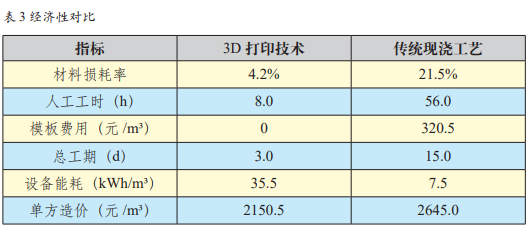 (2)经济性对比基于上海智慧湾步行桥悬链线拱工程的模型施工数据,对比 3D 打印 技术与传统现浇工艺的经济性。打印组采用六轴机械臂系统(图 1)完成拱体建造,混凝土材料单价为 620 元 /m³;现浇组采用 C40 商品混凝土(480 元 /m³)配合木模板施工。3D 打印技 术的高精度和高效能使得整个施工过程的资源消耗大幅度降低,尤其在材料浪费和工时方面,相较于传统工艺,具有显著优势。通过统计材料损耗、 人工工时、模板费用等核心指标,形成表 3 定量对比结果。 如 表 3 所 示,3D 打 印 技 术 通 过机械臂与混凝土泵送器的精准协同,将材料损耗率控制在 4.2%(现 浇 21.5%),验证了其资源集约化优 势。这种显著的减少浪费使得 3D 打 印技术不仅有助于降低成本,还有助于提高整体的施工效率和环境可持续性。模板费用全免与人工工时锐减至现浇工艺的 14.3%,使单方造价降低 18.7%。减少了模板使用和人工操作的依赖,大幅提高了施工效率, 尤其在复杂或定制化项目中,3D 打印技术的优势尤为突出。但设备能耗(35.5kWh/m³)显著高于现浇工艺 (7.5kWh/m³),主要源于六轴机械臂的高精度运动能耗。虽然设备能耗较高,但随着技术的进一步成熟和设备的优化,预计能耗将进一步降低。值得注意的是,打印材料单价(620 元 /m³)高于现浇混凝土(480 元 /m³), 表明规模化生产与本地化材料供应链建设是进一步降本的关键路径。通过推动本地化生产和材料的标准化,3D 打印技术在成本方面的竞争力将逐步增强,尤其是在大规模应用时,成本优势将更加明显。