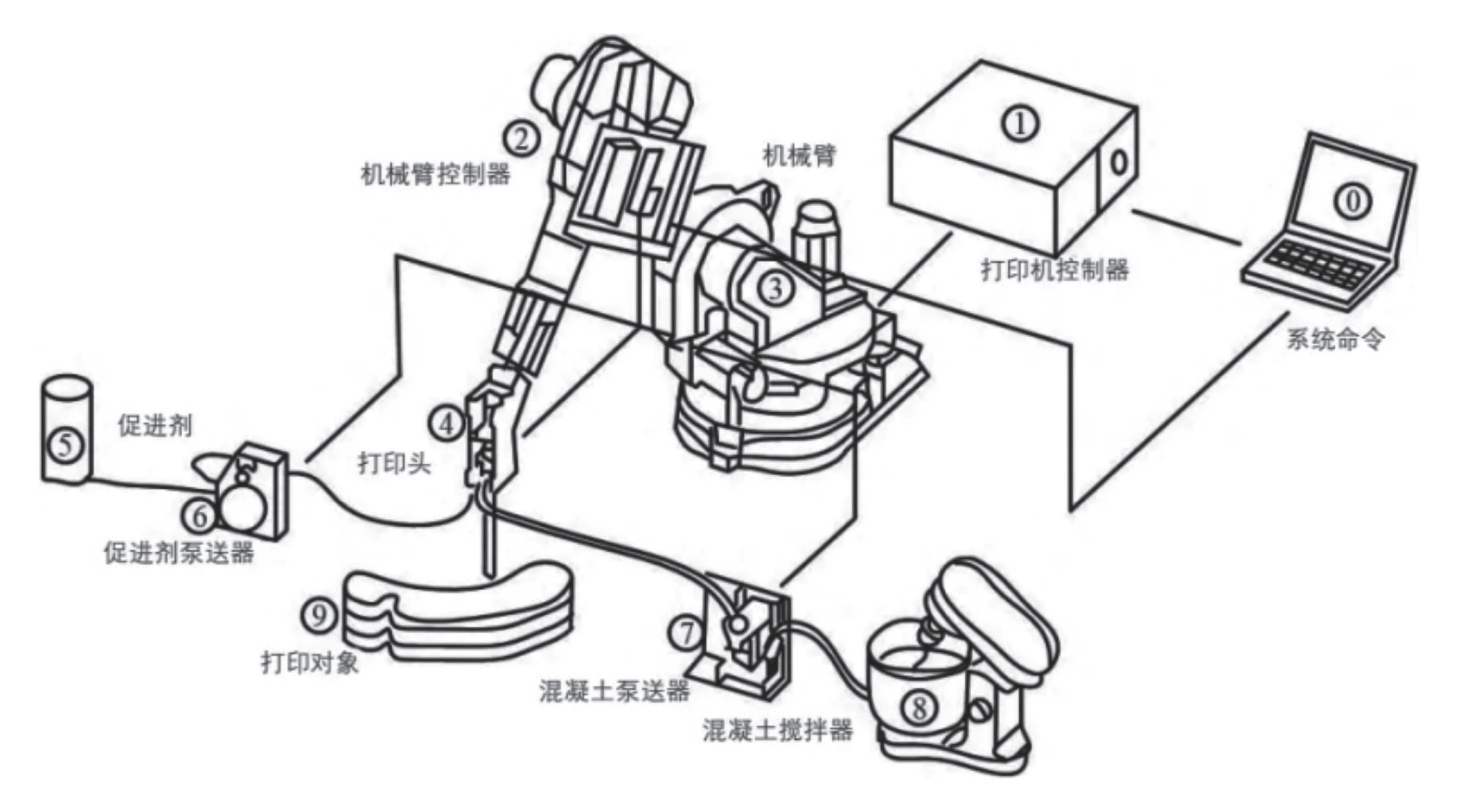 3D 打印混凝土技术流程以多系统协同控制为核心创新点(图 1):混凝土搅拌器通过动态配比制备触变性浆体,经混凝土泵送器定量输送至印头 ;机械臂基于系统命令解析的 G 代码驱动六轴联动,实现三维空间内连续挤出成型。在此过程中,搅拌器的动态配比系统确保了混凝土的最佳流变性能,避免了打印过程中材料的不均匀性或沉降,从而提高了建造精度和结构稳定性。同步运行的促进剂泵送器依据层间黏结强度需求,精准注入纳米级固化剂,形成“挤出-增强”同步闭环。固化剂的精准注入使得混凝土在打印的过程中能够快速固化,并在层与层之间形成高效的黏结,增强了打印构件的整体结构强度。计算机通过打印机控制器与机械臂控制器的实时数据交换,构建建造精度与材料性能的双向调控机制,突破传统工艺中形态、效率与强度难以协同优化的技术瓶颈。这一系统的实时监控和反馈机制能够在不同的施工阶段调整打印速度、材料配比和固化过程,确保每一层的质量和结构稳定性。这一技术的创新使得 3D 打印混凝土能够在保持高精度的同时,大幅提高生产效率,满足更复杂建筑形态的施工需求。此系统的实时数据反馈机制确保了在不同的施工阶段,材料和设备始终处于最佳工作状态,从而避免了因控制系统延迟或误差导致的结构弱点。