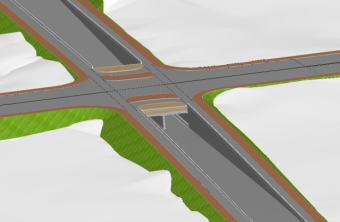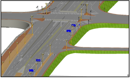 本步骤完成后,道路专业向照明、管线和交通专业提供添加横断面廊道后的路线文件,各专业可分别进行路灯、管线及标线标志牌的放置。添加横断面廊道后,道路专业主要进行相交道路和立交节点的设计,对于道路交叉口和立交匝道,平台软件有“土木单元”组件进行参数化设计并进行保存,在遇到相同交叉口或匝道形式时可进行直接使用和修改,减少工作量。