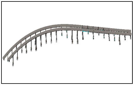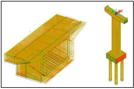 通过 ProStructures 软件进行桥梁和涵洞结构建模及配筋工作,桥涵专业首先对桥涵部件进行拆分,以保证每种尺寸结构建模仅进行一次,进行桥梁拼装时,相同尺寸桥梁结构仅进行参考,而不重新建模,以此减少建模人员工程量。桥涵专业根据道路专业提供中线进行桥涵总装,桥梁建模可见图 3、图 4。