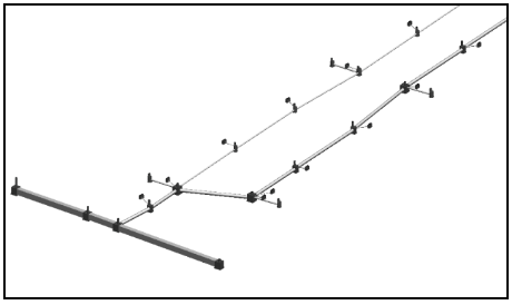 在道路专业向照明、管线和交通专业提供添加横断面廊道路线文件前,照明专业可使用 MicroStation 软件进行灯型、基础、箱变的建模 ;交通专业使用 MicroStation 软件进行标志牌版面、基础、信号灯的建模,使用 OpenRoads Designer 软件进行设计。在道路专业提供添加横断面廊道后的路线文件后,两专业通过 CivilStation Designer 软件进行路灯、标志牌、交通信号灯的放置。管线专业可直接通过 OpenRoads Designer 软件中的 SUE 插件进行管线、检查井的布设,给排水管线模型见图 5。