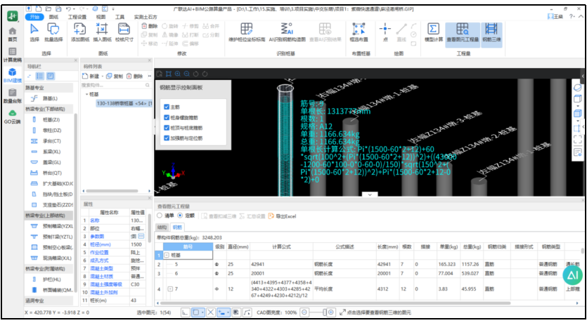 图 2 桩基 AI 识别平立剖大样图参数化建模快速、精准复核,工程量立体可见