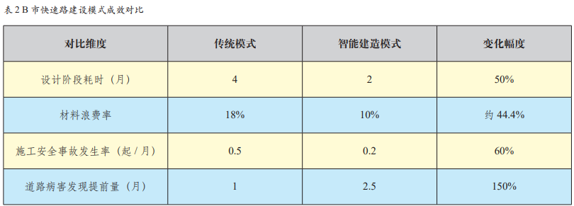 对比传统建设模式,智能建造技术为 B 市 城市快速路建设带来显著变化,具体数据如表 2 所示。