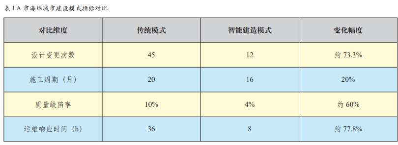 2. 应用成效 对比传统建设模式,智能建造技术在 A 市 海绵城市建设项目中的应用成效显著,具体数 据如表 1 所示。 由上述数据可知,智能建造技术大幅减少对比维度 传统模式智能建造模式变化幅度 设计变更次数 45 12 约 73.3% 施工周期(月) 20 16 20% 质量缺陷率 10% 4% 约 60% 运维响应时间(h) 36 8 约 77.8% 表 1 A 市海绵城市建设模式指标对比 了设计变更次数,有效缩短施工周期,降低质 量缺陷率,显著提升运维响应速度,全方位提 升了海绵城市建设与运维的效率和质量。