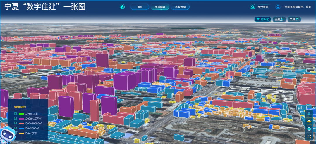 “图”的应用为住建行业数据管理赋予新的生命力,将成为城市信息模型基础平台的重要数据底座。去年,利用部里回流自治区的第一次全国自然灾害综合风险普查房屋建筑和市政设施调查数据成果,基于“天地图”搭建了全量建筑白模、重点区域三维精模和重点建筑 BIM 模型的房屋建筑“一张图”,全区 308 万栋房屋建筑、3700 公里市政道路、3368 公里供水管道、426 座市政桥梁实现“落图 +赋码”,并发放全国统一“数字身份证”,构建了“图形 + 属性”管理模式。