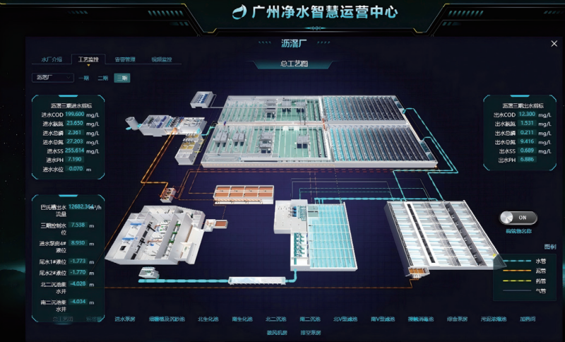 通过物联网、大数据、低代码等信息化技术,融合沥滘三期全生产要素实时数据,建立集厂区污水污泥管控、工艺全流程监视、三防应急监管、生产指标专题分析等功能为一体化生产管理平台,提升整体运营效能。 利用物联网和数字孪生等先进技术,通过 1 ∶ 1 建模,建成了国内污水行业中建模精度高、系统集成多、应用场景丰富的数字孪生系统,采集了 3500 多个设备及 17000 多个数据点,打造了虚实结合、孪生互 动的“数字化透明工厂”,为水厂少人值守夯实了基础,实现“生产数字化、管理透明化、巡检智能化、运维精准化”。