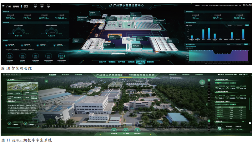 (一)因地制宜,聚焦城市新型地下污水处理厂难题沥滘三期净水厂运用“地下建厂,地上建园”景观设计理念,实施“平面组团”“空间叠加”集约化布局,污水处理设施转移到平均 17 米深的地下空间全封闭运行,将臭气、噪声等影响降至最低。厂区景观采用岭南园林手法,设置景观置石、花镜等特色景致 ; 通过高质量的出水,营造出南岭排渠的瀑布景 观 ;结合海绵城市理念,构建雨水花园、旱溪、草沟等自然形态,打造出湿地公园的自然环境,与一水之隔的海珠湿地生态相连、环境协调、 景观融合,被誉为广州南部的“人工绿肺”。这种与自然环境高度和谐的全新污水处理厂建设模式,为我国水环保设施建设提供了“广州样板” 和“广州方案”,推动广州成为全国地埋式污水处理规模最大、技术集成最先进、样板最美的水环保产业先进城市。 由于污水处理设备集约化转移至地下,运营成本、人员与园区的安全风险也相应高于传统污水处理厂。因此,针对地下净水厂的运营管理特点,以智慧技术构建低碳降耗闭环,驱动地下污水处理厂运营降本增效,同时聚焦运行、管理难题,通过信息化、智能化系统软件的高度融合,实现净水厂智慧安全管理。