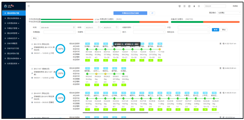 (二)“公交化”收运助推低碳转型升级。充分运用车载称重、垃圾桶赋码、视频抓拍等技术,构建“定时、定点、定车、定路线”的公交化收运模型,对生活垃圾来源、重量、清运时间和流向进行全程跟踪,有效破解垃圾桶占道摆放、混投满溢、脏污破损等难点问题。同时,总结归纳垃圾时空分布规律,深度分析清运车辆作业数据、运载能力,结合避高峰作业、周边扰民及车辆运载能力等要素考量,优化调整垃圾清运路线,提升清运效率 30% 以上,全年减少碳排放量达 15%,为清运单位降低运输成本 25 万元 / 年。