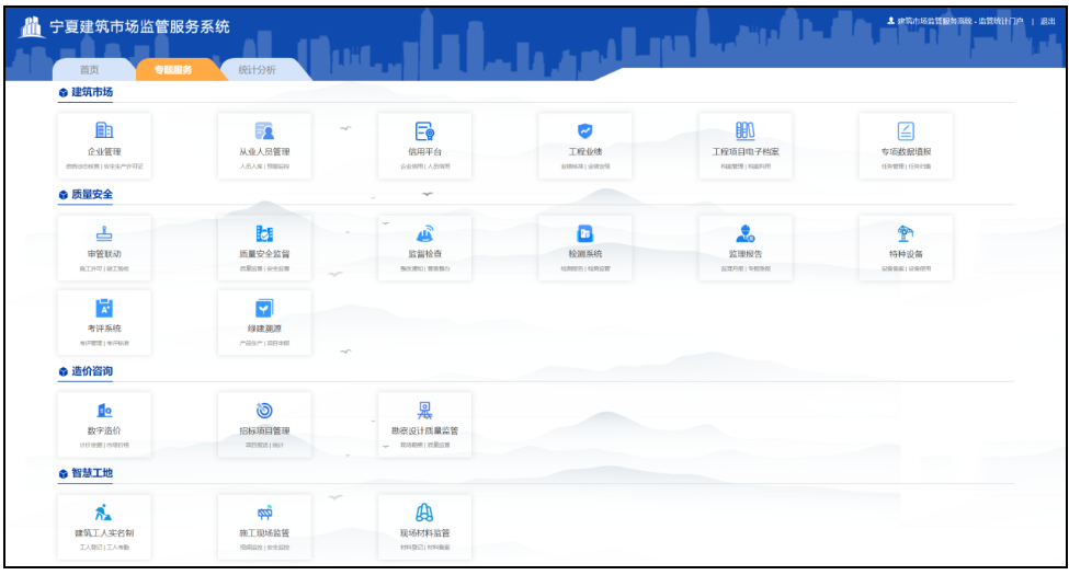 图 1 建筑市场监管服务系统专题服务功能模块界面