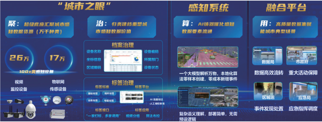 在技术架构上,项目集成“视频联网平台”“物联感知平台”“视觉大模型算法平台”与“感知融合服务管理平台”四大系统模块,形成“感、算、融、用”一体化能力体系。通过视觉 AI 大模型技术,实现对非结构化数据的实时解析与零样本算法生成,推动城市治理从“经验驱动”向“认知驱动”转型。