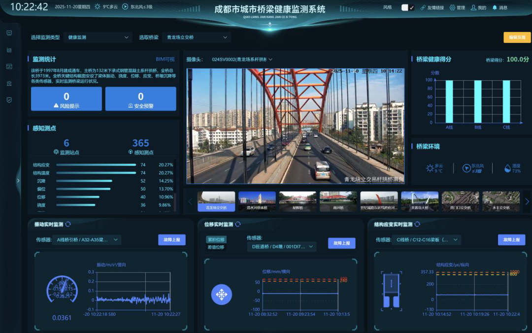 成都市在道桥智慧监管方面形成特色实践,坚持“一桥一策”原则,对 49 座重点市管城市桥梁建立监测系统。系统深度融合结构监测、视频监控、超载检测等多源数据,实时掌握桥梁运行状态。监测内容涵盖外部环境、外部作用、结构响应、结构变化等四大类 28 项参数。通过对桥梁监测数据、维护数据等多维数据进行清洗挖掘,建立桥梁健康状况评估模型,实现安全风险早期识别和预警。系统构建了“预警叫应 - 任务派发 -险情定位 - 动态监控 - 应急处置”的闭环管理机制,形成 30 分钟快速响应与评估上报能力。