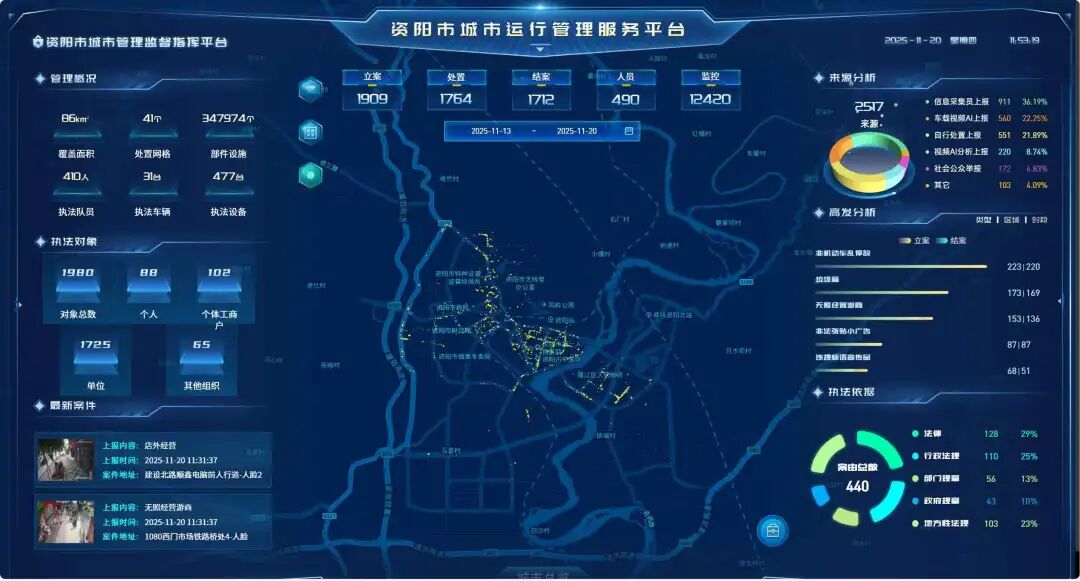 平台部署了数据智能、AI 分析、空间计算、物联网、工作流和统一认证六大智能引擎集群,融合了超百种算法。目前支持对市容环境、街面秩序、公用设施等 200 多类管理目标的智能识别与分析,综合准确率达 85%以上。基于低代码 / 零代码开发框架,提供高质量数据集、数据资源目录和标准化 API 接口服务,实现了全省 18个地市数据互通与多部门业务协同,日均处理案件超 6 万条,数据上报国家平台合规率 100%。