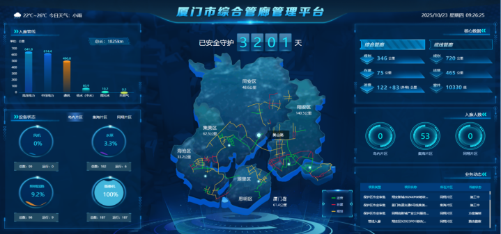 为贯彻落实党的二十大和中央经济工作会议精神及《中共中央 国务院关于推动城市高质量发展的意见》《中共中央办公厅 国务院办公厅关于持续推进城市更新行动的意见》《住房城乡建设部关于推进城市基础设施生命线安全工程的指导意见》等政策部署要求,厦门市扎实有序推进综合管廊相关建设,目前已建成投用干支线综合管廊约 120 公里,缆线管廊约 465 公里,已入廊各类市政管线总长超1800公里,相关经验成效推广至北京、济南、龙岩等全国 20 余个城市,为助力智慧韧性城市建设,贡献“厦门经验”。厦门市政管廊投资管理有限公司(以下简称“厦门管廊公司”)作为厦门市综合管廊建设运营企业,积极响应国家《关于构建数据基础制度更好发挥数据要素作用的意见》《“数据要素 ×”三年行动计划(2024—2026 年)》《可信数据空间发展行动计划(2024—2028 年)》等工作部署,在原有信息建设基础上,聚焦综合管廊安全高效和可持续发展,积极探索数据要素应用,挖掘数据价值,解决企业提质降本增效及安全应急等需要,打破系统“信息孤岛”、协同机制不畅等痛点难点问题,系统构建以多源数据融合为基础的管廊数据要素价值化体系,探索以数据要素为核心驱动力的城市治理现代化新路径。